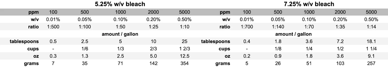This table lists the amount of 7.5% bleach solution required to reach 2000 ppm in containers of various sizes.